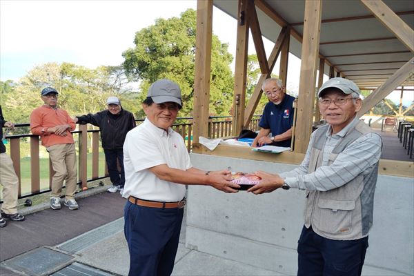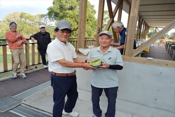 11月11日(土)鹿児島健康の森公園パークゴルフ場で16名の参加で開催しました。 雨上がりの爽やかな秋空の下、久しぶりの再会で楽しくプレーが出来ました。 優勝は黒川さん(100)、2位井手さん(101)、3位落合さん(106)、4位倉崎さん(107)、5位瀧内さん(109)でした。 飛び賞は7位,入佐さん、10位,重信さん。ホールインワンは黒川さん、倉崎さん、井手さんでした。 ニアピン賞は川崎さんと川畑さんでしたが、川崎さんがスタート時にいきなりホールインワンとなり 後の三人はホールインワンをしないとダメな状況を作ってしまい、必死に狙いましたがダメでした。 松永保男さんから新米(令和5年産うるち米で品種名:にこまる)2sを入賞者5人に提供がありました。 レポーター:井手隆志 |