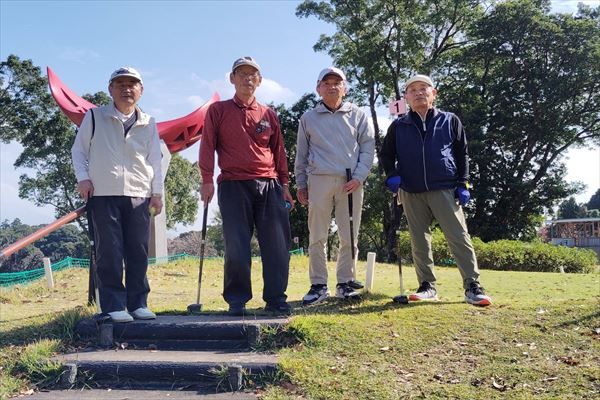 今年度のパークゴルフ大会を、爽やかな秋空のもと11月16日に 串木野パークゴルフ場で19名の参加で開催しました。 パークゴルフはクラブ1本とボール1個でプレーでき、年齢・性別・経験の 有無に関係なく誰でも気軽に楽しむことが出来ます。当日も家族連れなど、 沢山の方がプレーを楽しんでおられました。 競技は、4コース36ホールで行われ、後半の登り下りの多い難コースに 苦戦しましたが、ホールインワンに3名成功するなど白熱したなか元気に 和気あいあいと過ごしました。 優勝はホールインワンを出した黒川忠満さん、準優勝は山下又志さん、 三位は瀧内文夫さんでした。 (レポーター 金富寛幸) |
