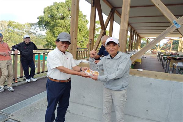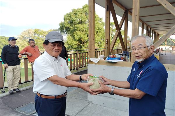 11月11日(土)鹿児島健康の森公園パークゴルフ場で16名の参加で開催しました。 雨上がりの爽やかな秋空の下、久しぶりの再会で楽しくプレーが出来ました。 優勝は黒川さん(100)、2位井手さん(101)、3位落合さん(106)、4位倉崎さん(107)、5位瀧内さん(109)でした。 飛び賞は7位,入佐さん、10位,重信さん。ホールインワンは黒川さん、倉崎さん、井手さんでした。 ニアピン賞は川崎さんと川畑さんでしたが、川崎さんがスタート時にいきなりホールインワンとなり 後の三人はホールインワンをしないとダメな状況を作ってしまい、必死に狙いましたがダメでした。 松永保男さんから新米(令和5年産うるち米で品種名:にこまる)2sを入賞者5人に提供がありました。 レポーター:井手隆志 |